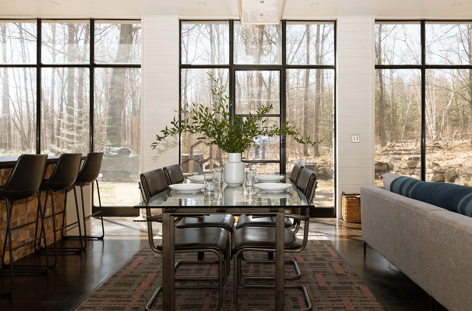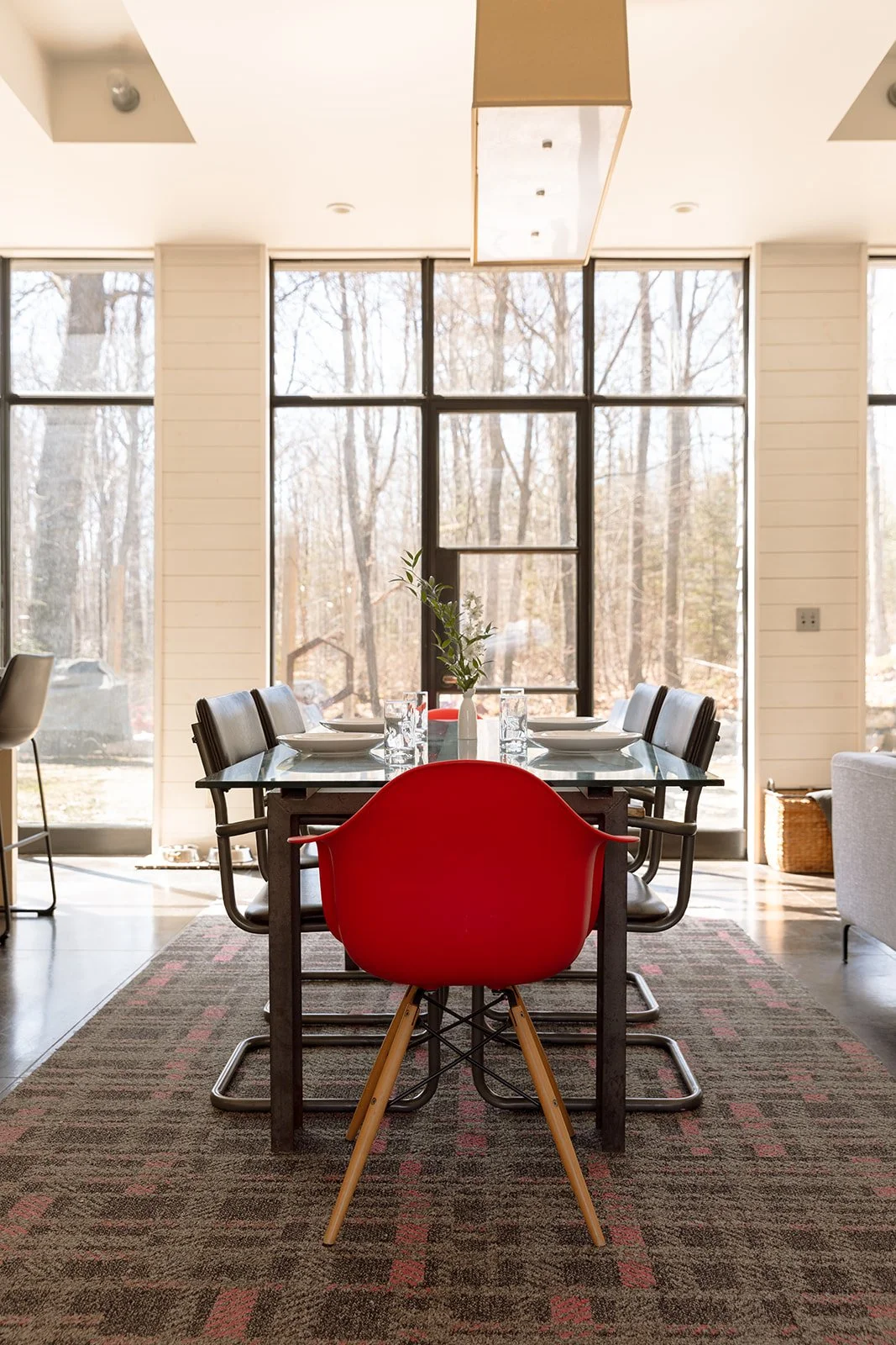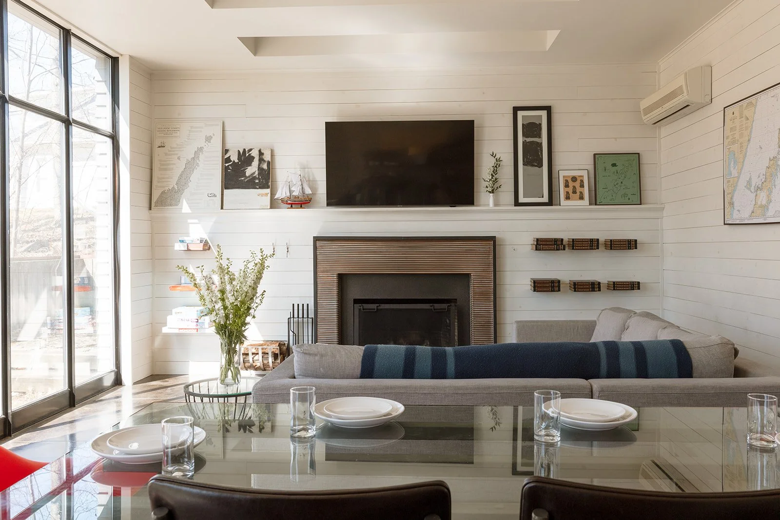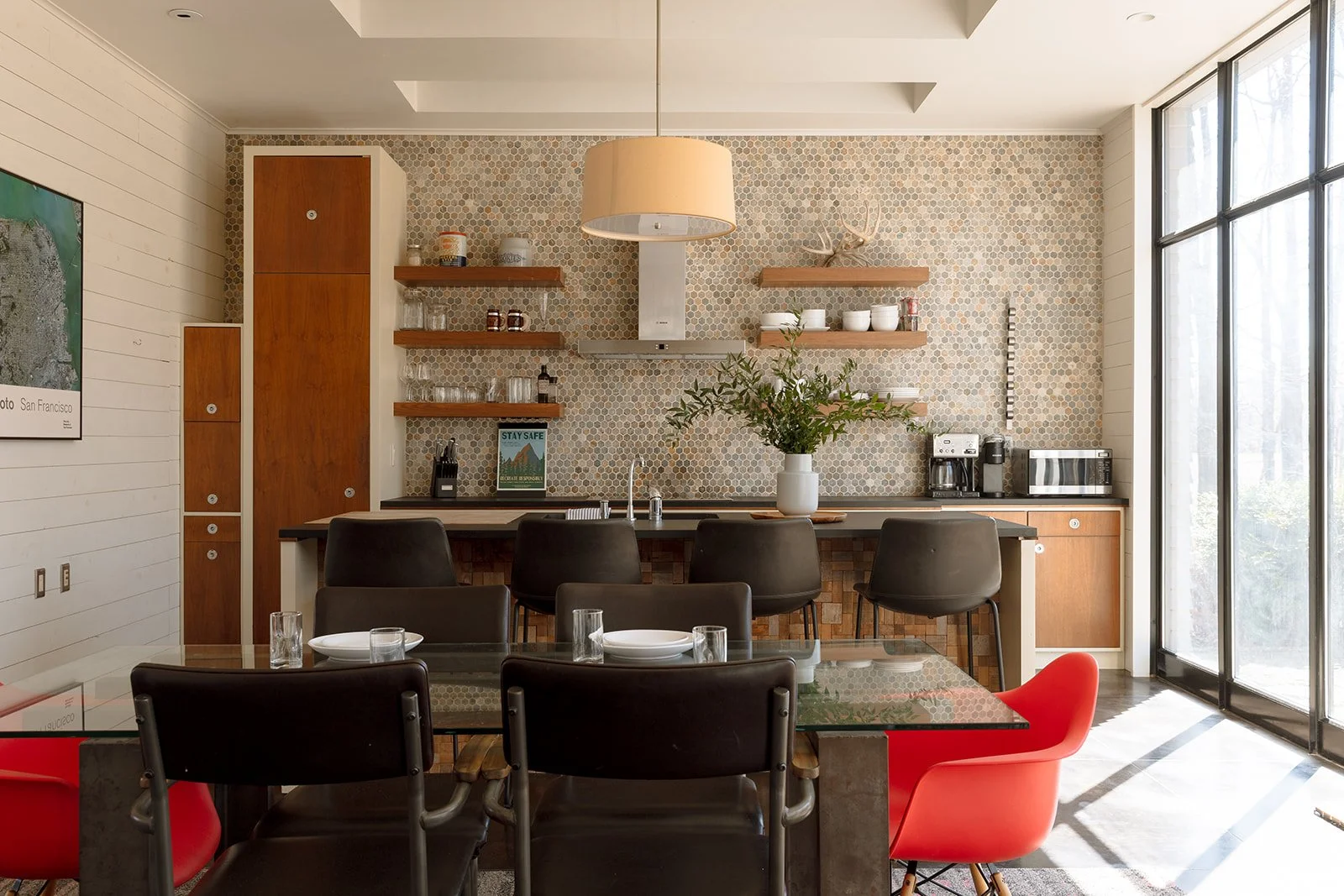 This modern style home offers guests a great cooks kitchen with everything included to make a fresh, locally sourced meal. The kitchen shares the first floor with a dining and living room, all bathed in natural light from the complete wall of windows.